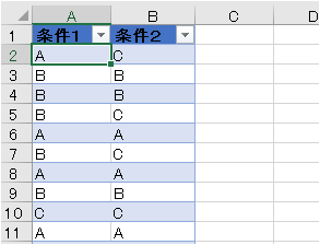 例えば、条件1と条件2がともにBの場合は〇を出力する、などのケースです