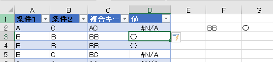 この場合は複合キーをもとにした別表を作成し、VLOOKUP関数で参照して〇を出力します