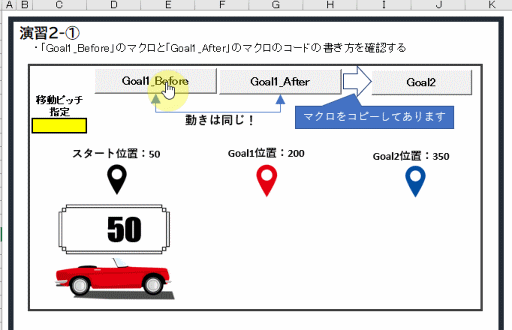 Goal1_BeforeとGoal1_Afterのマクロは、同じ内容で赤い車を動かします