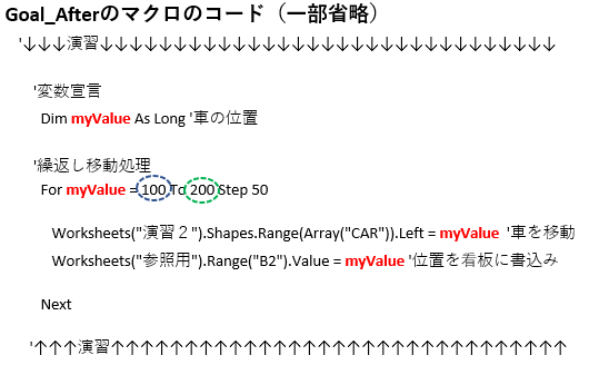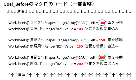 そして、違うマクロでは上のAfterのコードを書き替えて、Goal2まで車が動くという演習でした!