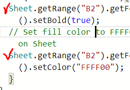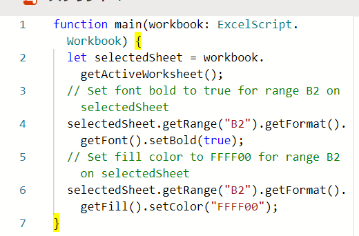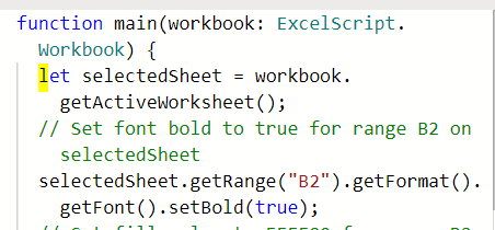 ですので、次に続くコードはselectedSheetすなわち「選択・処理しているシート/単数」 の 「getRange(“B2”)=B2セルの内容」 「getFormat=書式」 の 「getFont=フォント」 を 「setBold(true)=太くする」になります