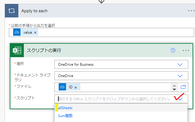 上のGIF画像では、ファイル欄にIDを設定した途端に「Apply to each」というものが適用されています