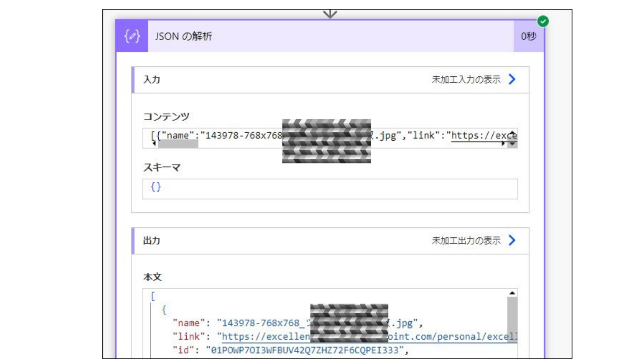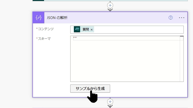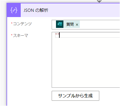 「コンテンツ」にFormsの画像での回答を動的コンテンツで設定後、スキーマの欄に一旦「””」を入力してフローを動かします