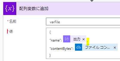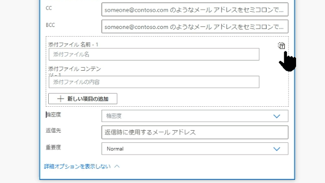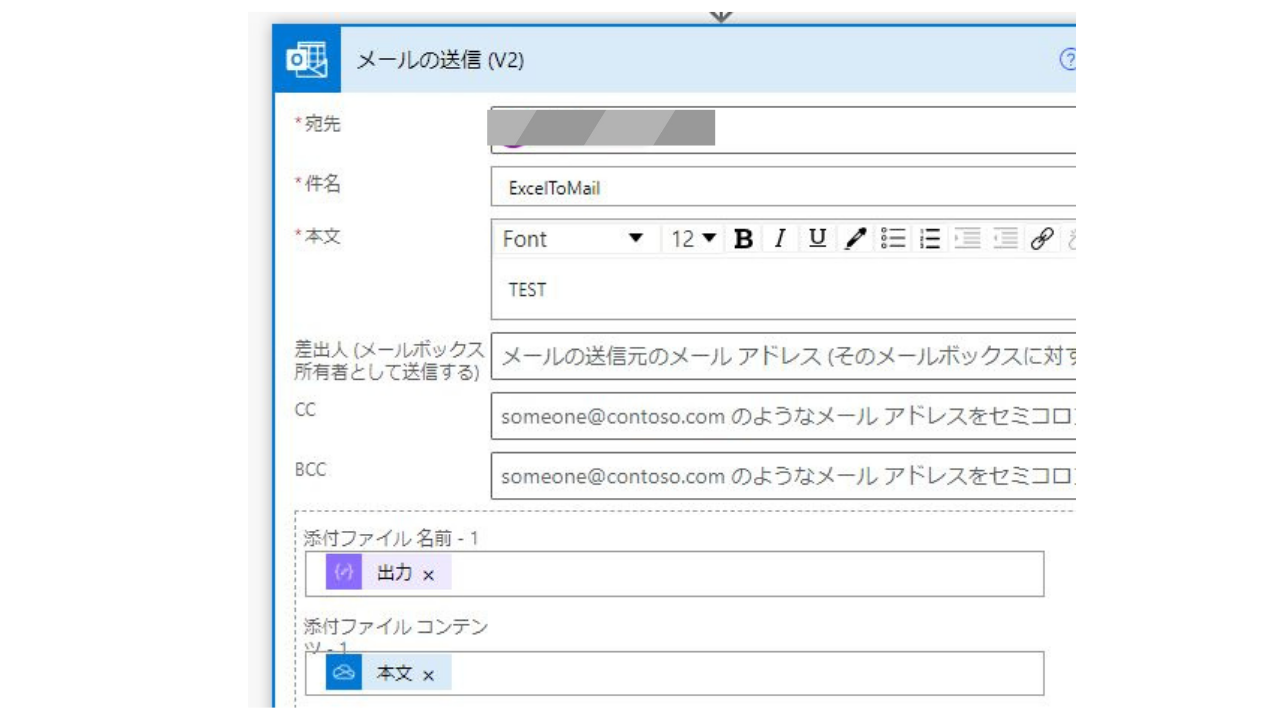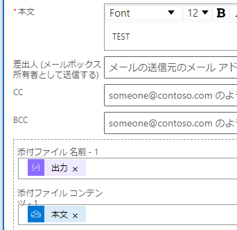 これでファイル名とファイルコンテンツが揃ったので、メール作成アクションを設定します