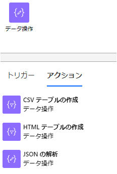 データ操作コネクタ内の「JSONの解析」アクションを使用するのですが、こちらはコード/スキーマが必要になってきます