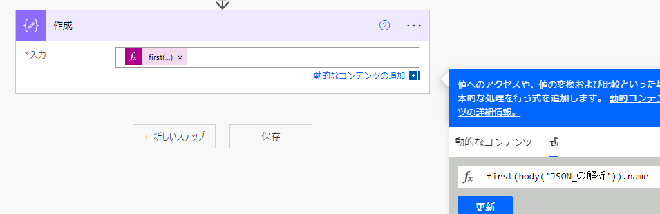 この「JSONの解析」アクションで取得した内容から、「作成」アクションを通じて前述の「name」を抽出します