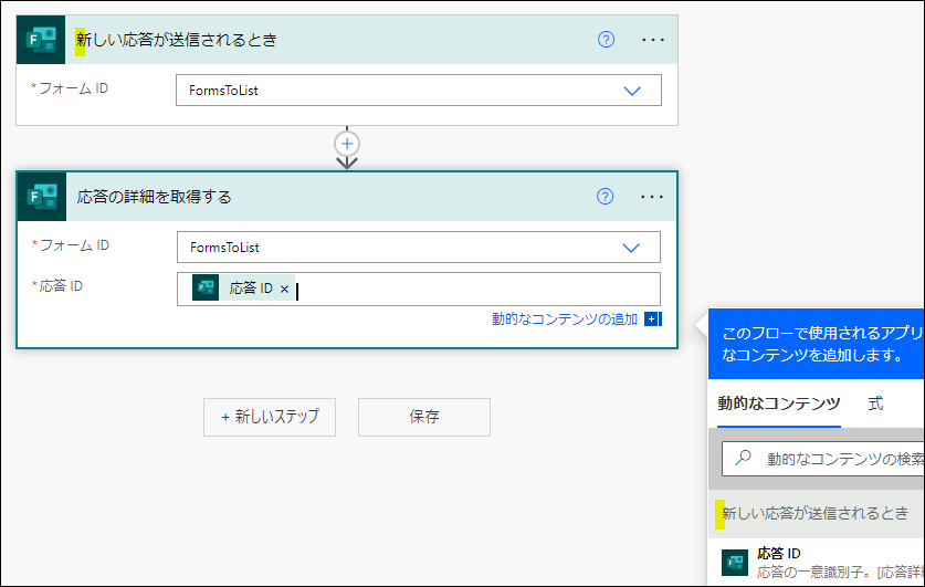 「新しい応答が送信されるとき」と「応答の詳細を取得する」この2つのアクションでFormsの回答を取得します