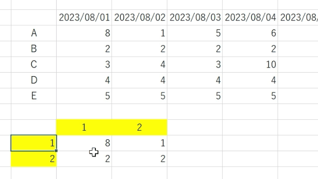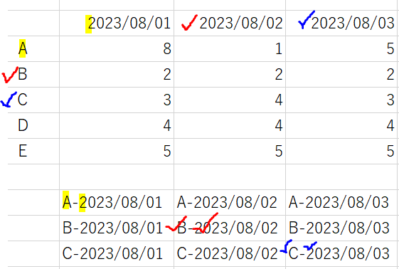 例えば、範囲の1行目1列目の「8」は「A-2023/08/01の8」と表示することができます