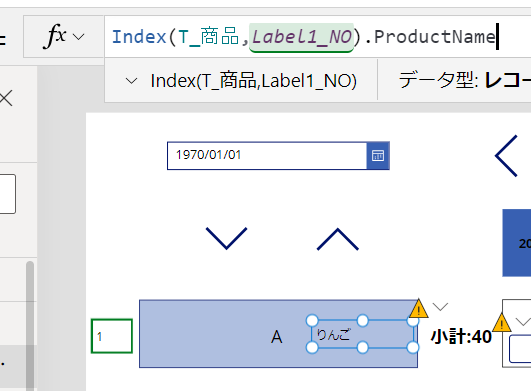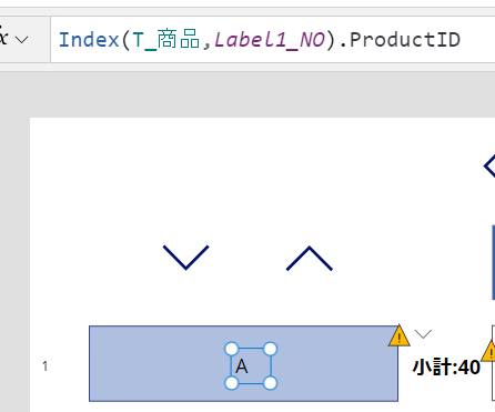 Power Appsの場合はセルの組み合わせではなく、次の画像のようにLabelの組み合わせ、VLOOKUP関数で値をSharepointリストから抽出します