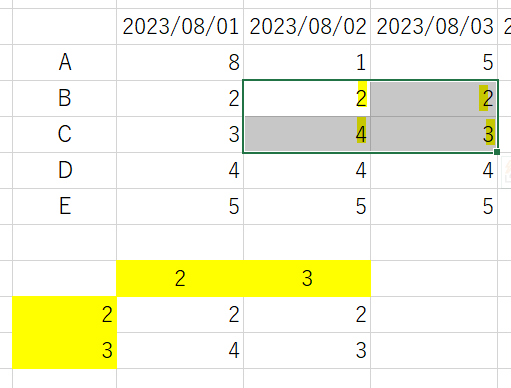 下の画像であれば、指定範囲の2行目2列目~3行目3列目をそれぞれ抽出します