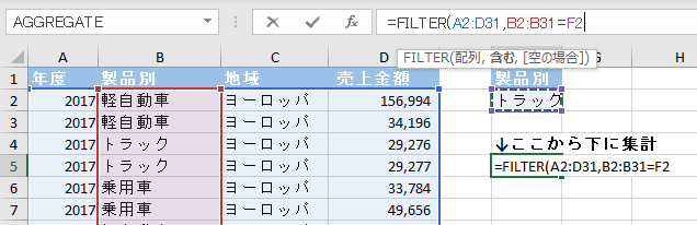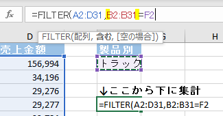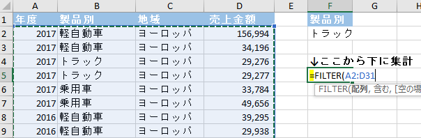 Filter関数はF5セルに入力しただけですが、抽出範囲から「製品別」の列の内容が「トラック」に該当する「全ての行」が抽出されます