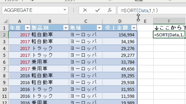 並び替え範囲を「Data」というテーブル名にてテーブル化した上で、実際にSORT関数の並び替えを行います
