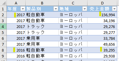 こちらのデータにて、「売上金額」の行を降順で並び替えます