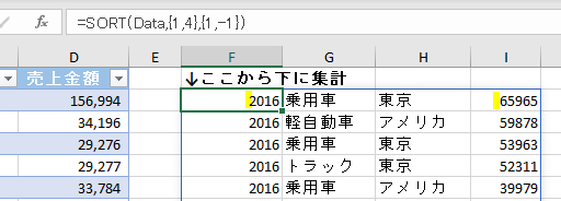 今までの並べ替え機能との違いは、データ自体を並び変えるのではなく、他の箇所に出力されたデータを並び変える点です