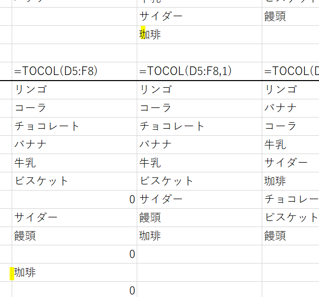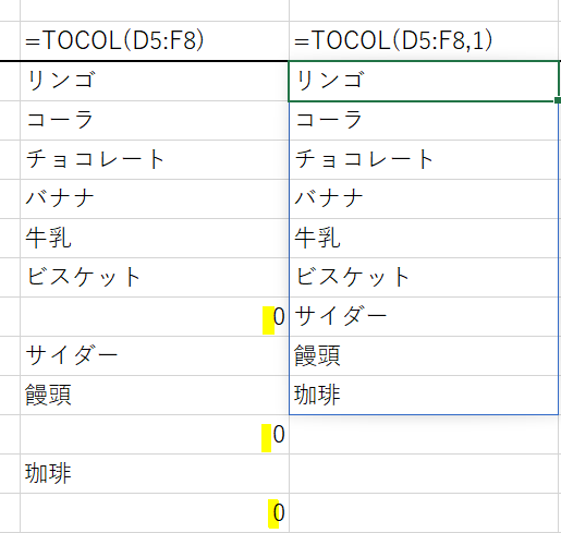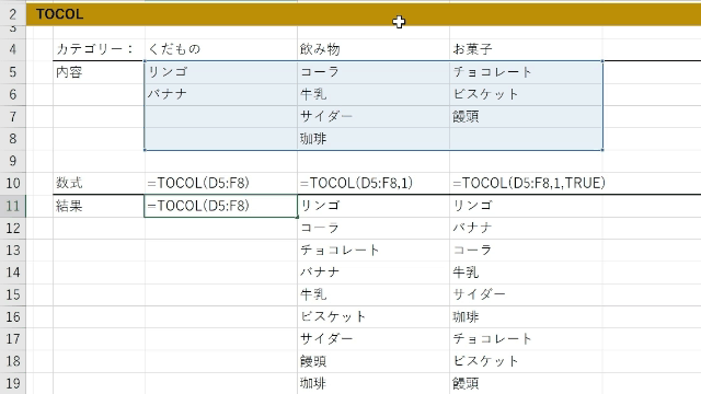 TOCOL関数と同様に、三引数をTRUEで指定すると、データを横方向ではなく縦方向に読み込みます
