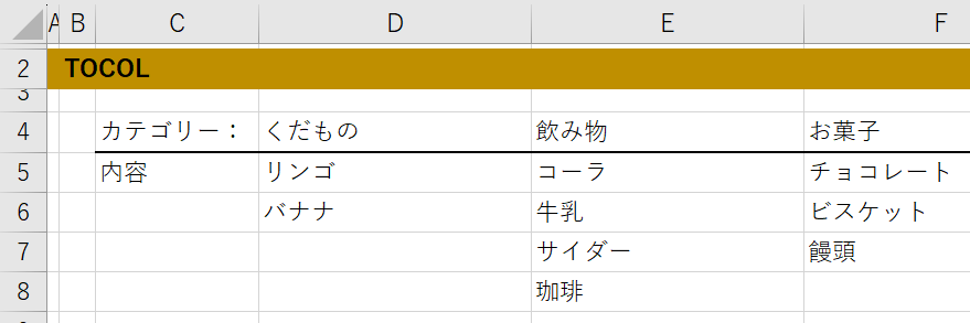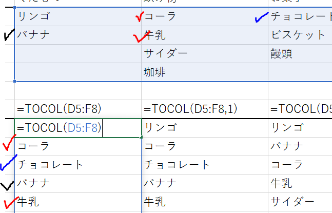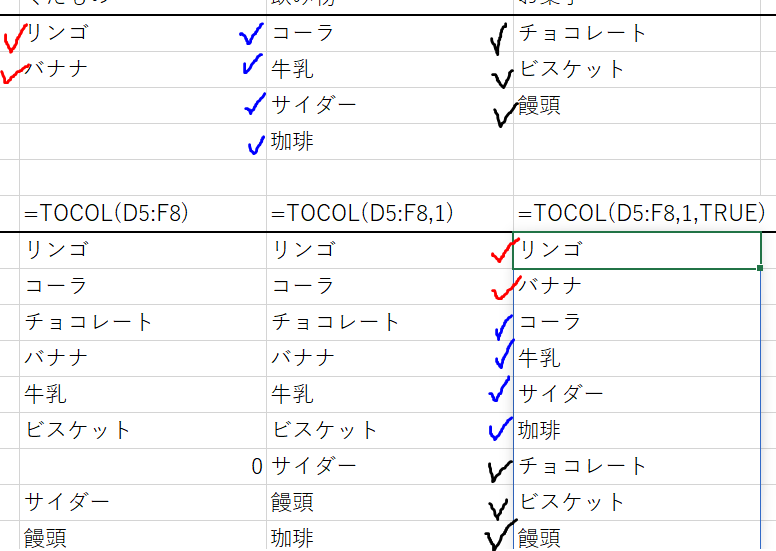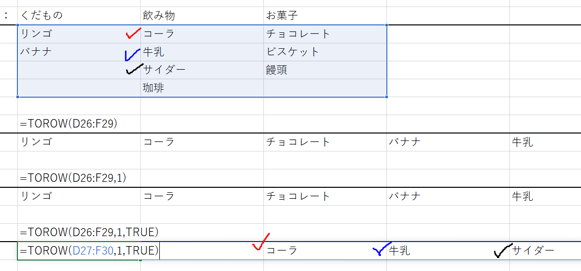 TOCOL関数と同様に、三引数をTRUEで指定すると、データを横方向ではなく縦方向に読み込みます