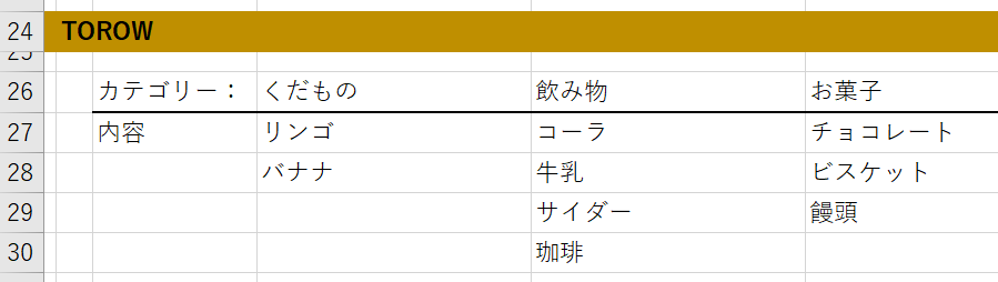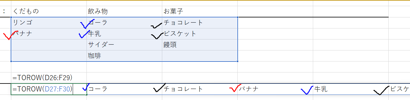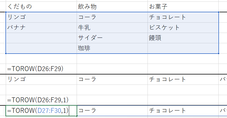 TOROW関数の中に行列を入れ替えたい範囲を指定します