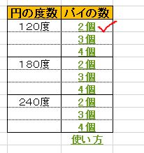 度数別、パイの数別のシートに移動したら、各パイのサイズを決めます