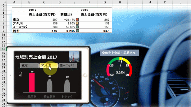 レーシングカーのコクピットにまるで座っているかのように、1画面で組織に必要な数字を魅せるテクニックです!画面内容をボタン一つで切り替えられるので、オンラインでの数字説明に最適です
