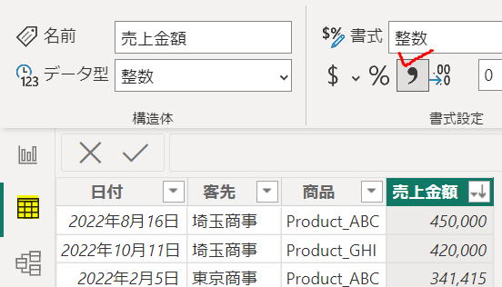 ですので、データビュー画面に移動して「コンマ」を付けます