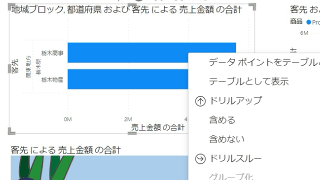 上のGIF画像では、横棒グラフの「栃木商事」の箇所からドリスルーすることにより、「栃木商事」にフォーカスしたページに自動で移動しています