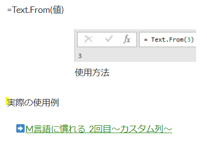 右側のM関数の列にあるテキストをクリックするとMicrosoft社の解説ページに遷移します