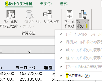 上の画像のように「ピボットグラフ分析タブ」⇒「フィールドボタン」とクリックすると「すべて非表示」が表示されますので、こちらのチェックを外すだけです