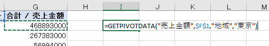 ところが、そのままピボットテーブルのデータを活用すると上の画像のように「GETPIVOTDATA」と表示されてしまいまい、うまく参照ができません