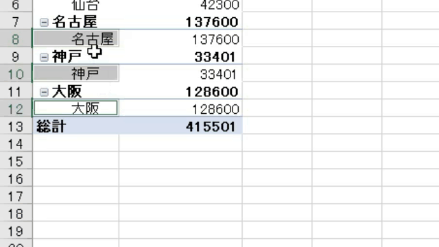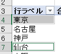 上の作業で「東日本」にグループ化する「東京、仙台」をグループ1でまとめ直したので、次に「名古屋、神戸、大阪」をグループ2にまとめます