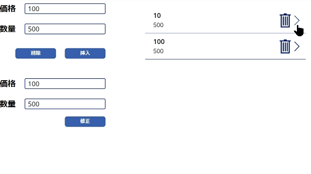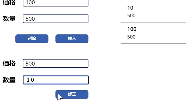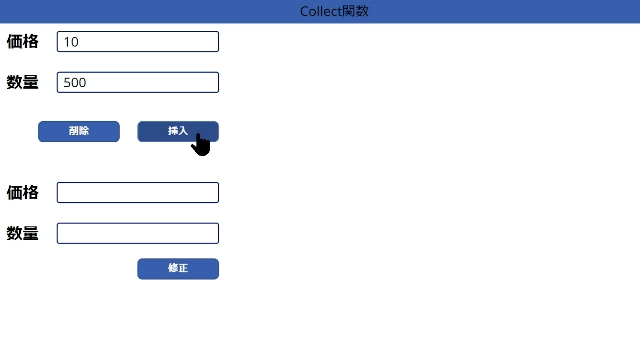 今回は変数:myCollect内のmyPriceとmyQuantity列にテキストボックスに設定した値を設定します