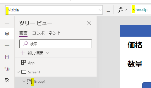 今回は該当のグループのVisibleに変数:showUpを設定します