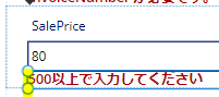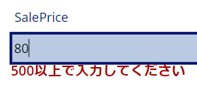 Coalesce(Parent.Error,If((Value(DataCardValue2.Text)<500) && !IsBlank(DataCardValue2.Text),”500以上で入力してください”))