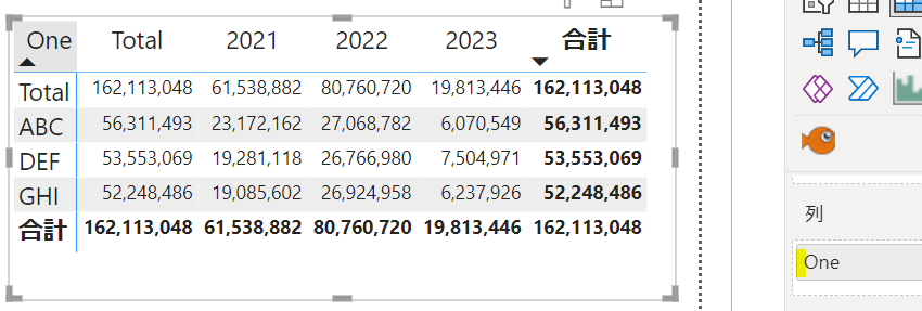 Oneの列では「Total」にManyの全ての内容が集約されるようにします