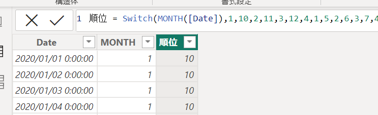前述の月の並び替えの場合は、並び替え対象が「MONTH列」で順位列の式が「順位 = Switch(MONTH([Date]),1,10,・・・」となっています