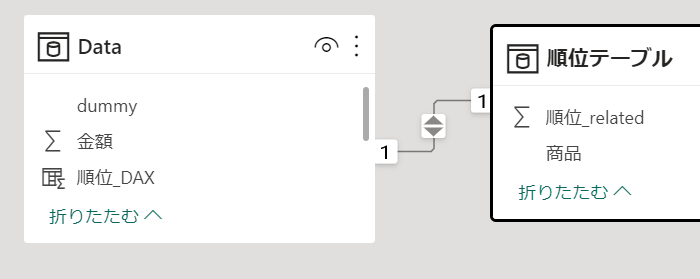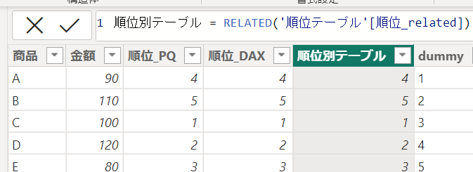 次にデータビュー画面でDAX(RELATED関数)を作成し、順位列を作成します