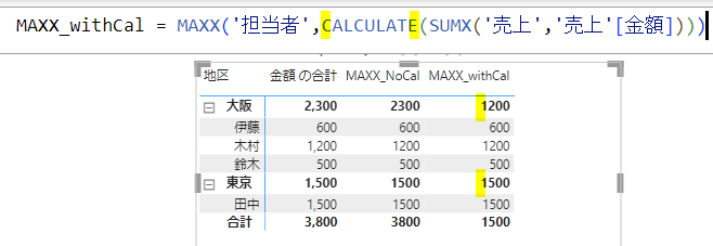 MAXX_withCal = MAXX(‘担当者’,CALCULATE(SUMX(‘売上’,’売上'[金額])))