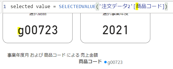ドリルスルーする際に選択した項目を明示するには「SelectedValue()」というDAX式を使用してメジャーを作成します