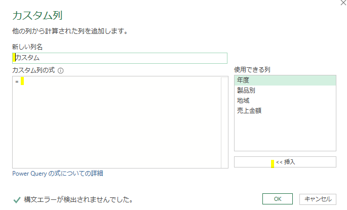 こちらの画面では「新しい列名」「カスタム列の式」を指定します