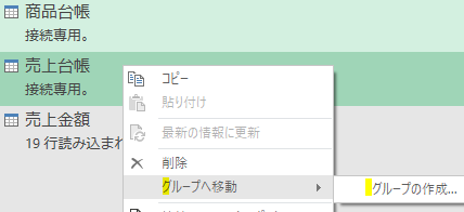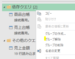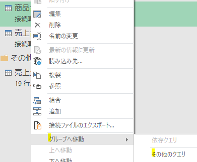 クエリをグループ間で移動させたい時には、移動させるクエリを右クリックし、次の画像の黄色の箇所をクリックします