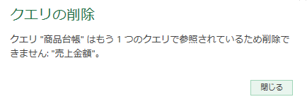 すると、「商品台帳クエリ」は「売上金額クエリ」に依存されているため、下の画像のようなメッセージが出て削除ができません
