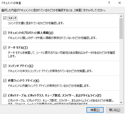 次に「ドキュメントの検査」が開くので、画面下の「検査」ボタンをクリックします