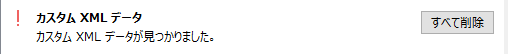 クエリがファイル内にあると、下の図のように「カスタムXMLデータが見つかりました。」とメッセージが出ます
