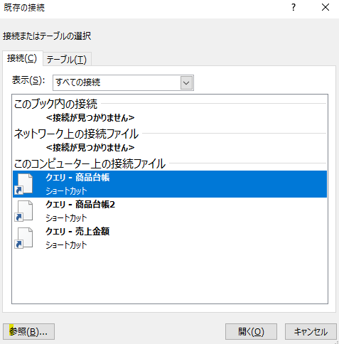 上の図の「参照」をクリックすると、バックアップしたクエリを指定できるようになります