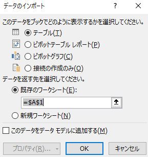 クエリを復元する時には、下の図のように「データのインポート」画面が開きますので、こちらで読込先を指定します