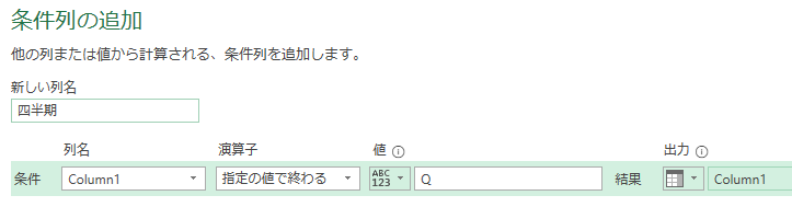 こちらの機能にて「Qで終わるデータのみ出力を行う」という条件列の作成を行います