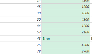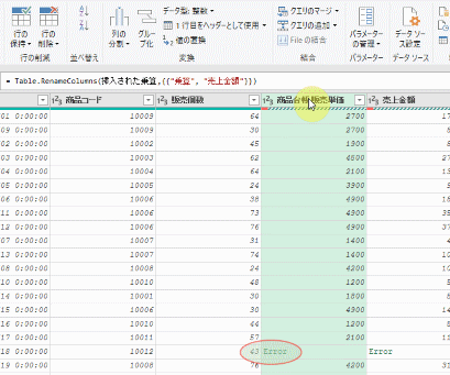 すると、Power Queryエディターが開き、下の画像のようにエラー箇所が表示されます