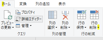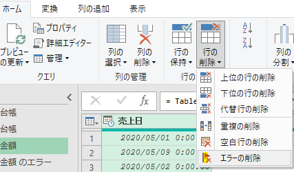 但し、どうしてもその方法では対処できない場合にはPower Queryエディターのホームタブで「エラーの削除」処理を行います