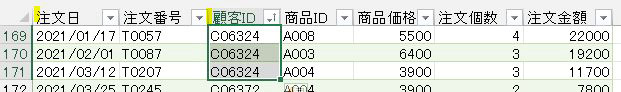 ですので、注文データ内では1つの顧客IDに対して、上の画像のように複数の注文日が存在したりしています