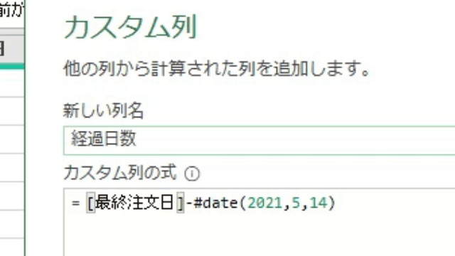 上のGIF画像ではカスタム列・作成画面にて[最終注文日]から2021年5月14日の日付を差し引いています