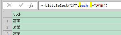 ➡ List.Select(部門/前ステップ名 , each _ = “営業”)